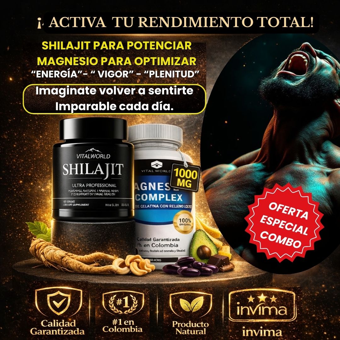 Nuestro combo incluye 1 pote de Shilajit de 60 gr. + 1 pote de Magnesio Complex de 100 capsulas blandas, ambos originales de la marca Vital World.